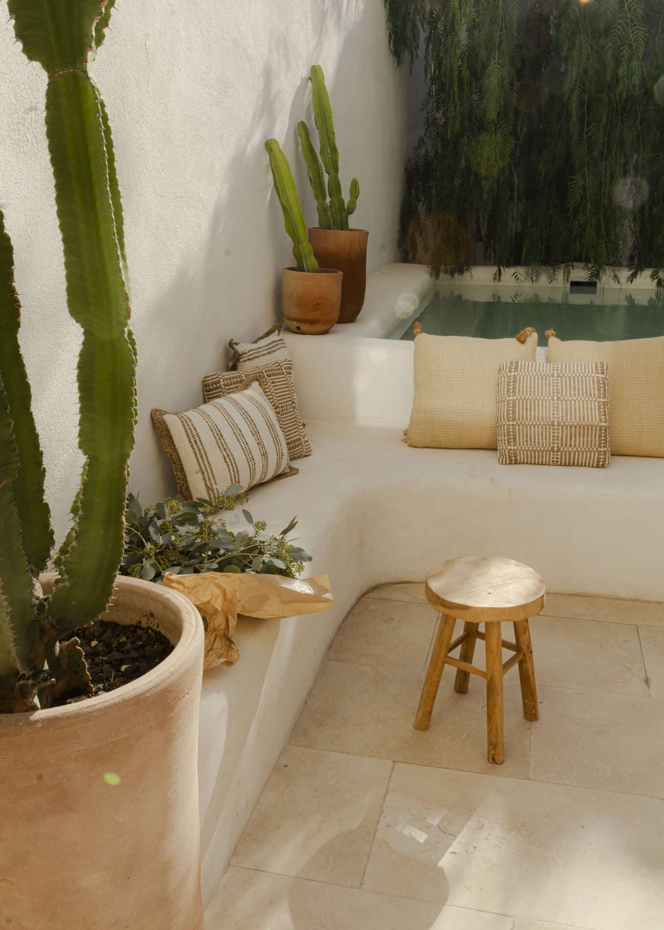 Particularité du spotSitué au rez-de-chaussée d’un immeuble ancien, ce lieu surprend par son élégance contemporaine et la douceur de son atmosphère. Dès l’entrée, on perçoit une belle profondeur de champ entre la chambre principale et la pièce de vie, offrant un axe visuel qui se prolonge jusqu’à l’extérieur. Le salon, baigné de lumière naturelle grâce à de grandes ouvertures en hauteur, s’ouvre sur un patio végétalisé au charme méditerranéen. L’espace extérieur, intime et apaisant, s’organise autour d’une petite piscine aux lignes douces, bordée de banquettes en pierre blanche et d’une végétation luxuriante. Une véritable respiration en plein cœur de la ville. L’intérieur mêle lignes modernes et chaleur artisanale : sol en pierre claire, mobilier en bois blond, murs immaculés et détails arrondis qui adoucissent l’architecture. Les plafonds hauts accentuent la sensation de volume. La cuisine, ouverte sur le salon, reprend les codes du design méditerranéen contemporain : façades en bois clair, crédence graphique, table ovale et suspension sculpturale. L’ensemble évoque un art de vivre simple et raffiné. L’atmosphère générale est douce, blanche, végétale et lumineuse — un décor parfait pour des scènes d’intérieur contemporaines, d’art de vivre, de jeune couple, ou pour des shootings mode et déco.