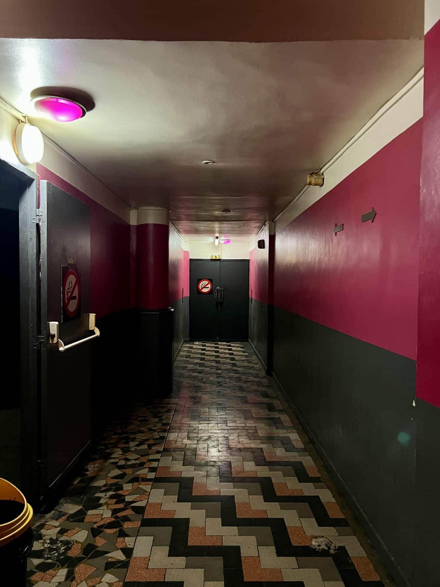 Le lieu fonctionne comme un labyrinthe fermé, avec une identité forte. La circulation en boucle et les multiples accès secondaires permettent un vrai jeu de poursuite, de disparition et de tension narrative. L’ambiance est sombre, tamisée, presque hors du temps, avec une lumière chaude mêlée de touches rouges qui accentuent le caractère clandestin du lieu. Les matières usées, les banquettes continues et les volumes renforcent une sensation d’enfermement et d’anonymat. Les escaliers et les couloirs constituent les points forts visuels, offrant des perspectives marquées et un fort potentiel dramatique. L’ensemble crée un décor chargé, organique et immédiatement cinématographique. Ce lieu est particulièrement adapté à des univers de thriller, de polar ou de drame psychologique, capable de porter une scène à lui seul et même de devenir un véritable personnage.